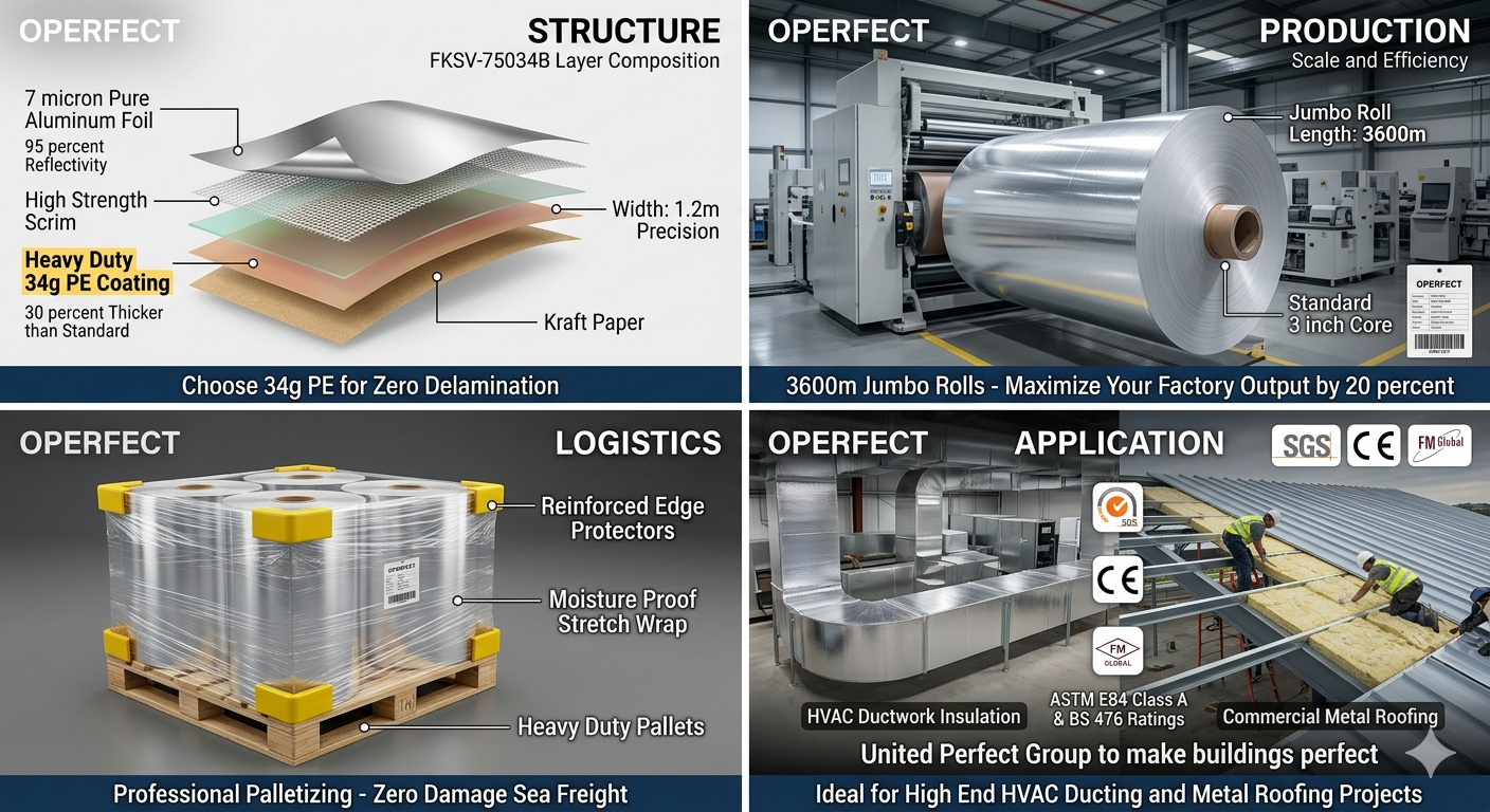 - OPERFECT™ Solution: FKSV-75034B utilizes our industry-leading 34g PE Coating for heavy-duty thermal lamination. This physical anchoring technology ensures that the foil and kraft paper remain “inseparable” under extreme heat or humidity, matching the full lifecycle of world-class buildings.