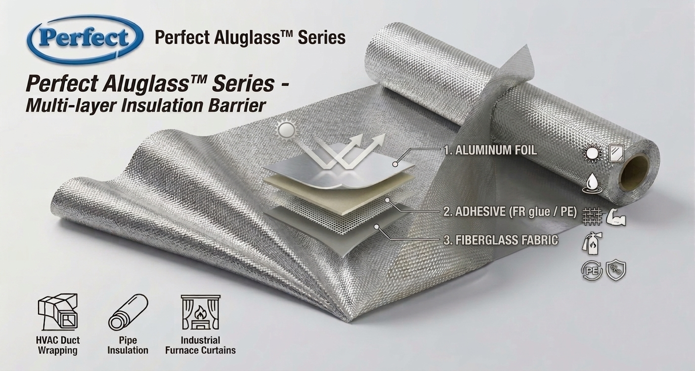 Perfect Aluglass is a premier thermal insulation facing engineered by laminating high-purity aluminum foil onto a heavy-duty fiberglass fabric base. Using our proprietary high-bond adhesive technology, we provide a robust radiant barrier designed for the most demanding industrial and HVAC environments.