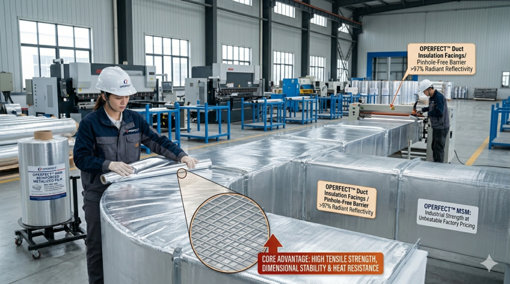In large-scale steel structure projects and industrial insulation, budget constraints often force contractors to choose between “strength” and “cost.” OPERFECT™ (by Jinan United Perfect Building Materials Corporation) eliminates this compromise with our MSM (Mylar / Scrim / Metalized PET) series. By leveraging our vertical manufacturing advantage in Jinan, we offer a high-tensile, tear-resistant radiant barrier at price points that challenge standard non-reinforced films. OPERFECT™ MSM is the ultimate choice for projects requiring high-volume, high-performance facings without the premium price tag.
