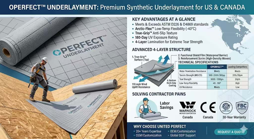 With over 24 years of specialized manufacturing excellence, Цзинаньская корпорация строительных материалов United Perfect is proud to offer the OPERFECT™ series. Our mission is simple yet powerful: “To Make Buildings Perfect, together.” We empower contractors across the U.S. and Canada with a product that outperforms traditional felt in every measurable category.